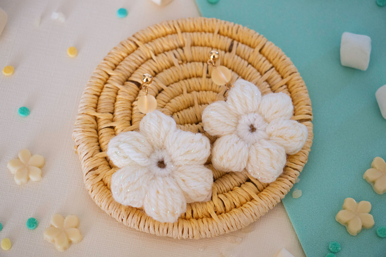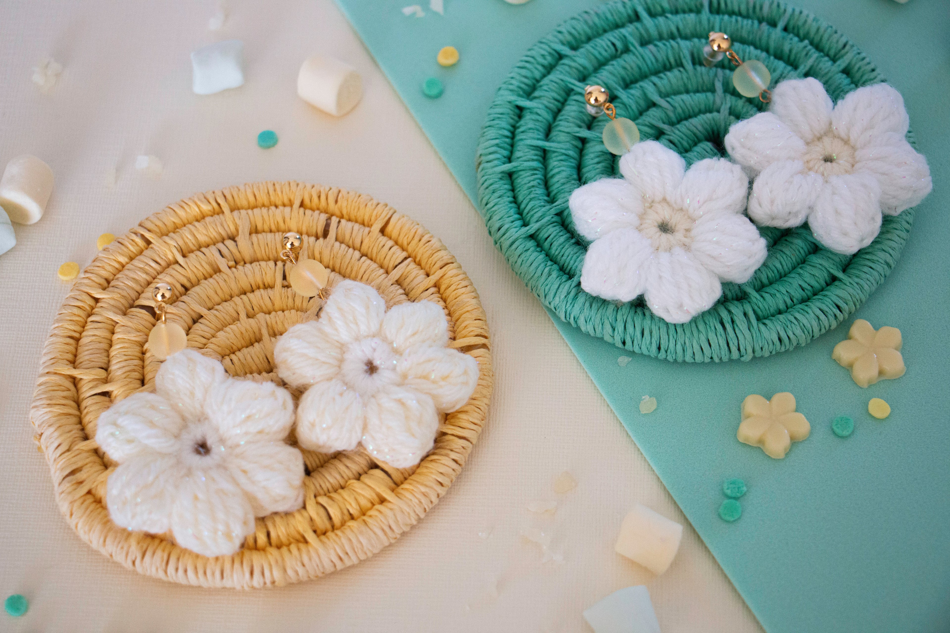 Handmade Flower Crochet Earrings - Pastel Yellow and White - Gold Plated Hooks